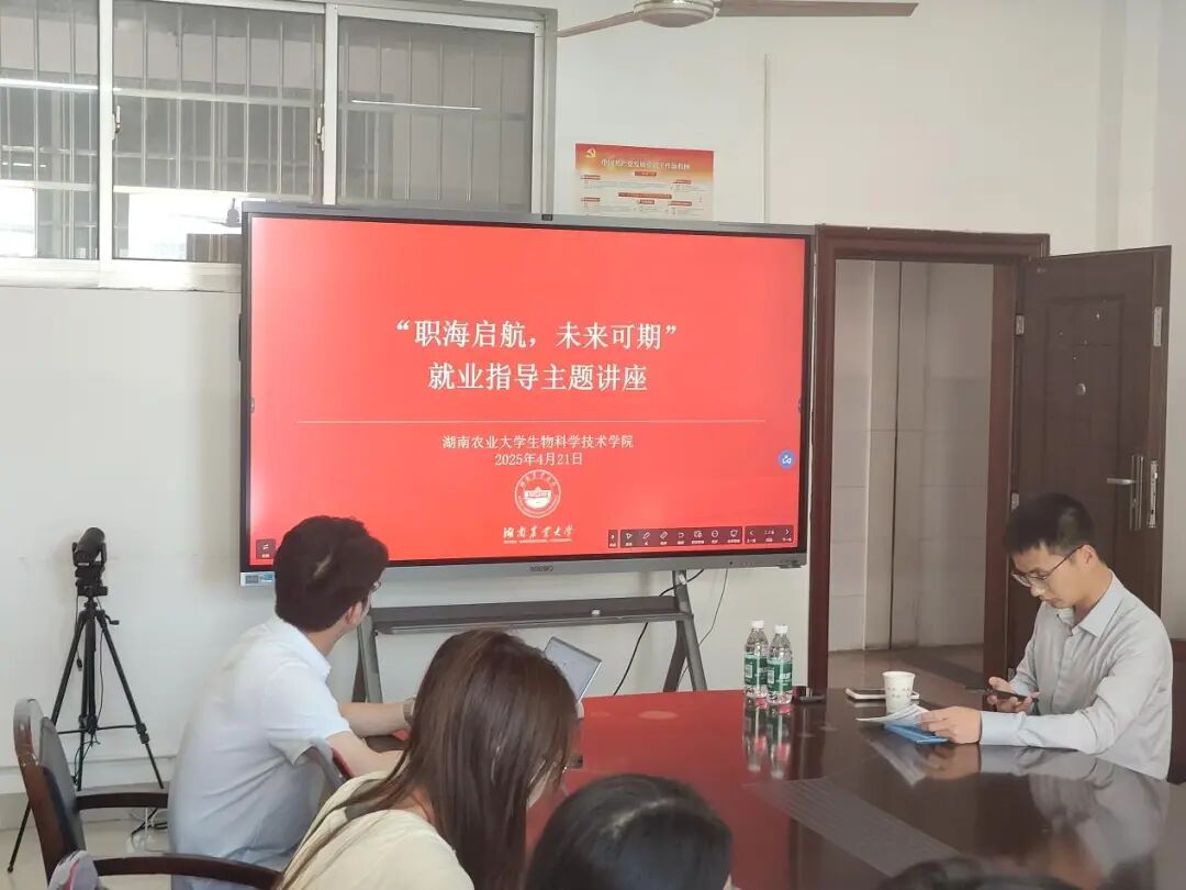 2025年4月21日下午,湖南农业大学生物科学技术学院“职海启航,未来可期”就业指导讲座在第十一教学楼南506室成功举办。本次讲座邀请双胞胎集团股份有限公司人力资源经理丁康指导,旨在帮助学生明确职业发展方向,提升就业竞争力,吸引了学院各年级学生踊跃参与,现场座无虚席。