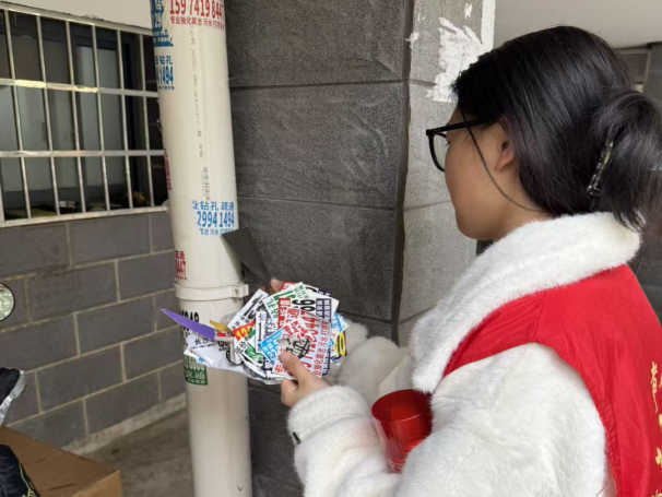 活动现场,志愿者们身着统一的志愿服装,精神饱满、热情高涨,迅速投入到清理工作中。大家按照提前划分的区域,两两一组、分工协作,针对不同类型的小广告采取针对性清理方式:对于粘贴较浅的纸质小广告,志愿者用垃圾夹轻轻撕下,装入垃圾袋;对于黏贴牢固、残留胶渍的顽固小广告,先喷洒除胶剂进行浸润软化,再用铲子一点点细心铲除,最后将铲除的碎屑、残留垃圾全部用垃圾夹收拢打包,做到清理一处、洁净一处。过程中,志愿者们不怕脏、不怕累,不放过任何一个角落、不遗漏任何一处小广告,哪怕是墙角缝隙、楼道拐角等隐蔽位置,也认真细致地反复清理。面对部分层层叠加、难以清除的小广告,大家齐心协力、耐心处理,用汗水换来了社区环境的焕然一新,过往居民纷纷驻足点赞,对志愿者们的奉献精神给予高度认可。