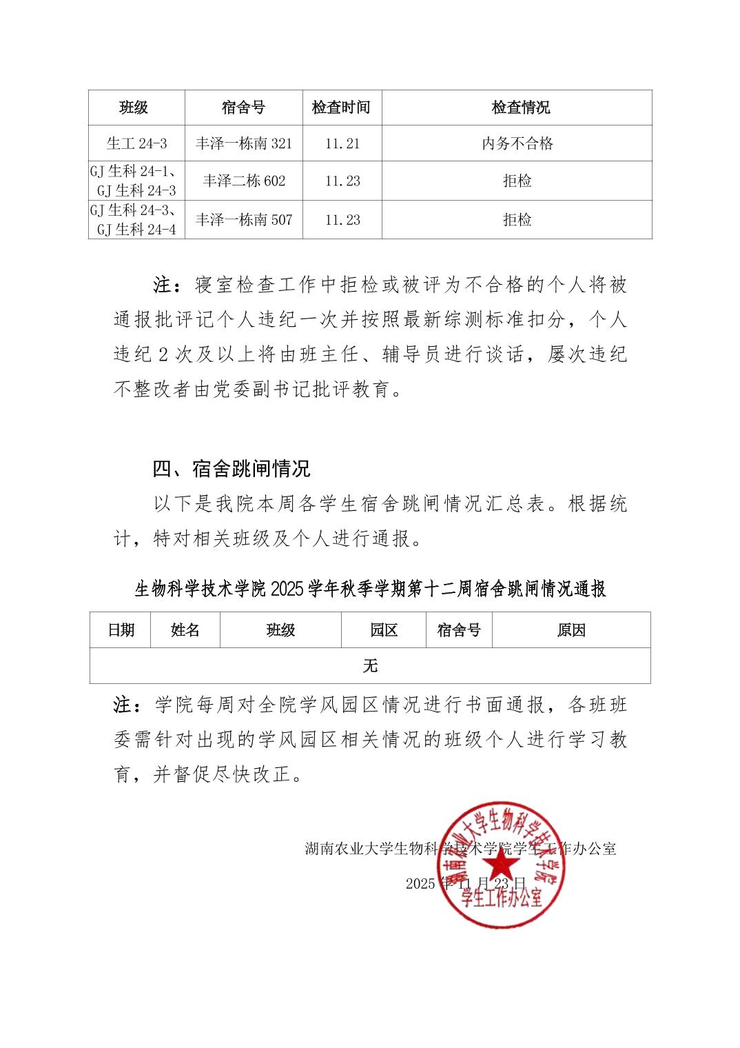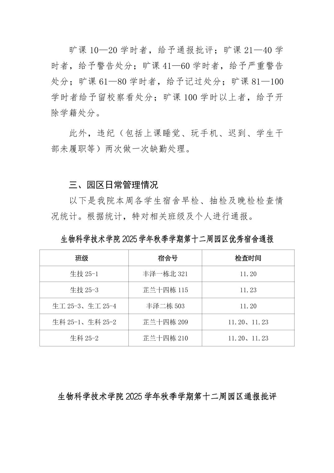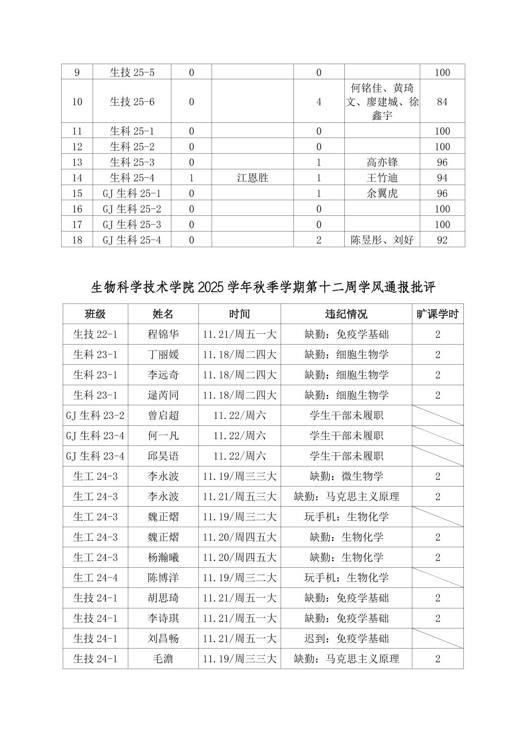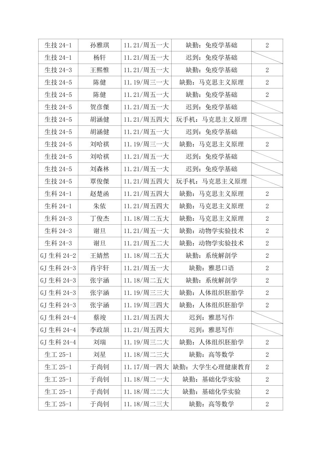2025年秋季学期生物科学技术学院第12周日管通报