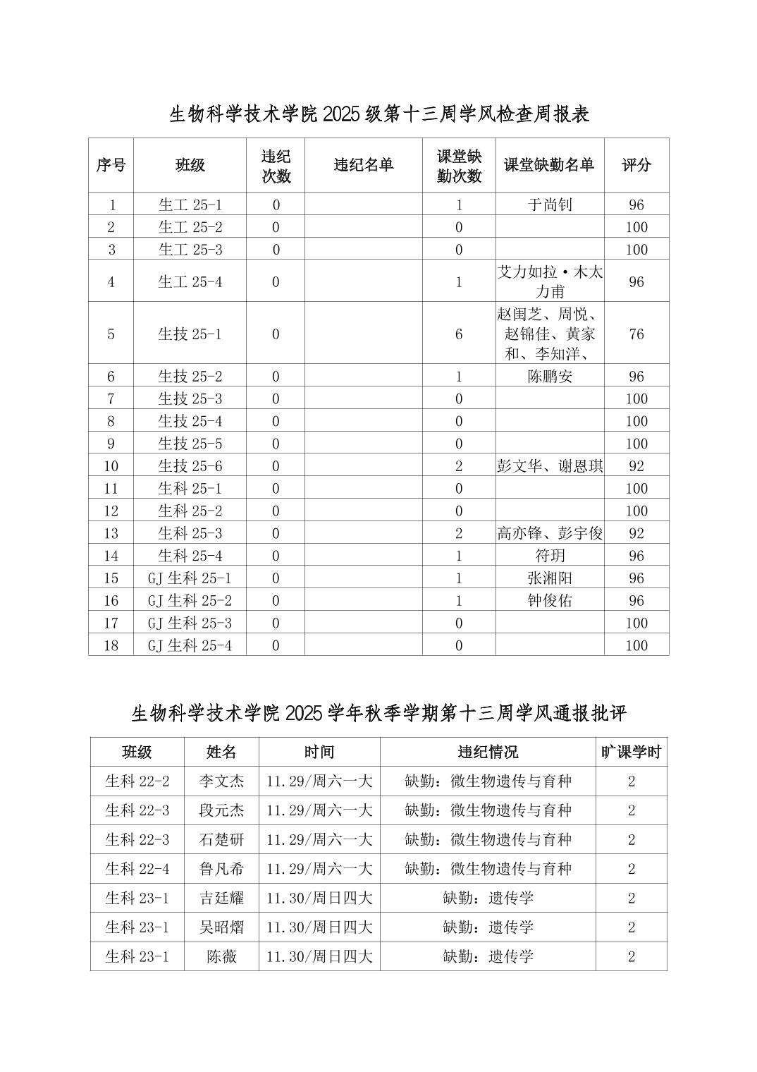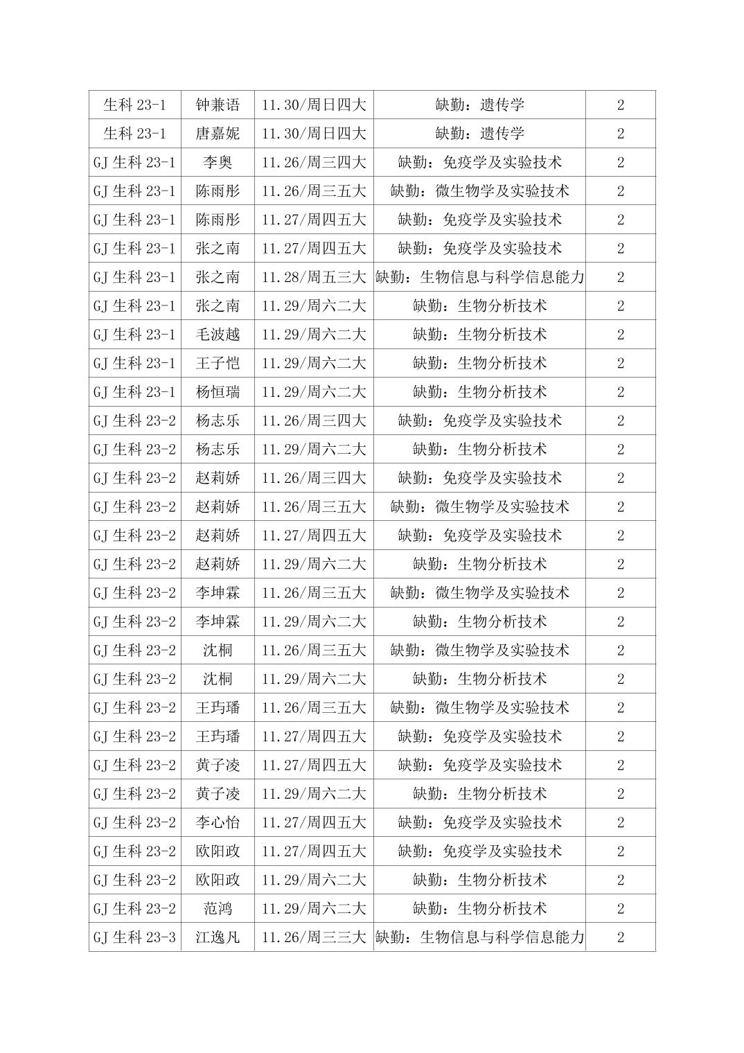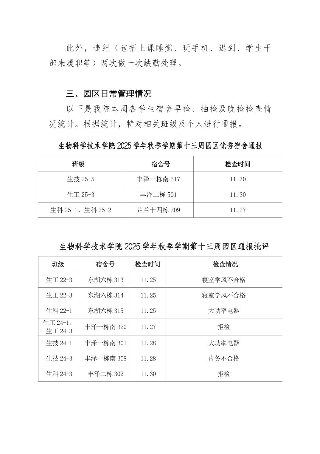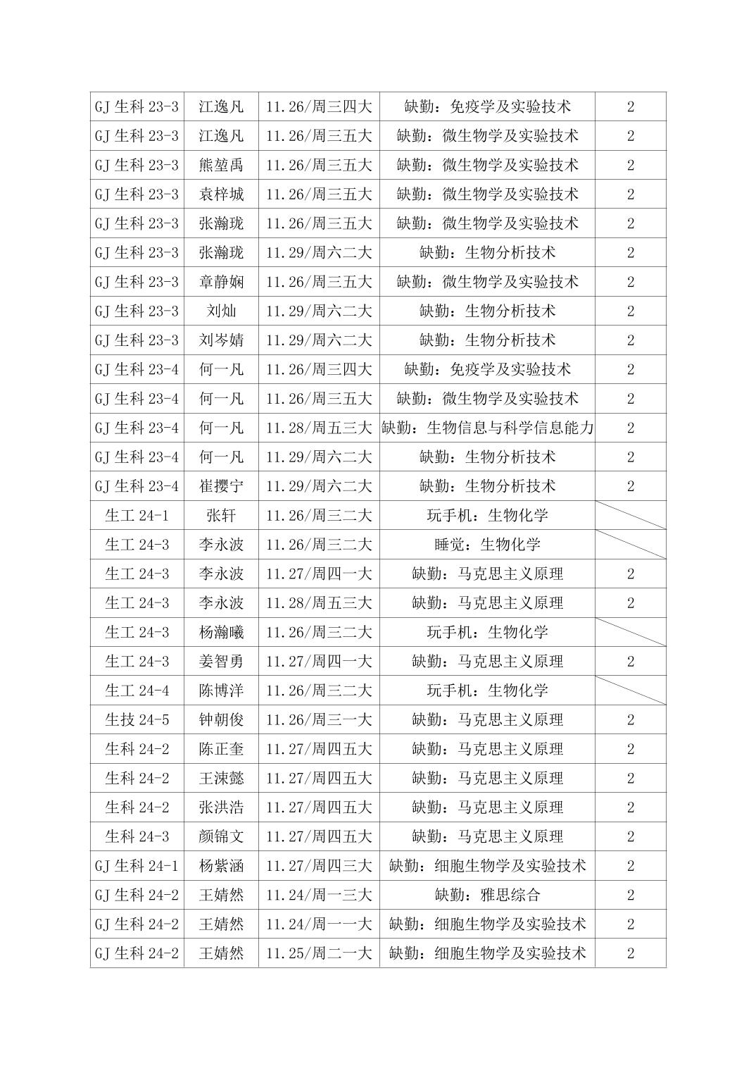 2025年秋季学期生物科学技术学院第13周日管通报