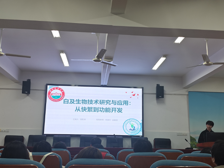 最后,生物科学技术学院胡钧涛同学以“白及生物技术研究与应用”为主题展开分享。他从白及的药用价值与产业现状切入,详细解读了分子标记辅助育种、组培苗快繁等核心生物技术如何破解传统种植难题,大大缩短了白及育苗周期,减缓了野生资源的压力。结合物联网智能种植、低温破壁提取等前沿技术案例,胡钧涛重点分析了白及多糖在医药创伤修复等领域的多元应用,展现了这一珍稀药材从种植到深加工的全产业链价值,其数据化的产业分析与前瞻性的技术展望让在场听众深受启发。