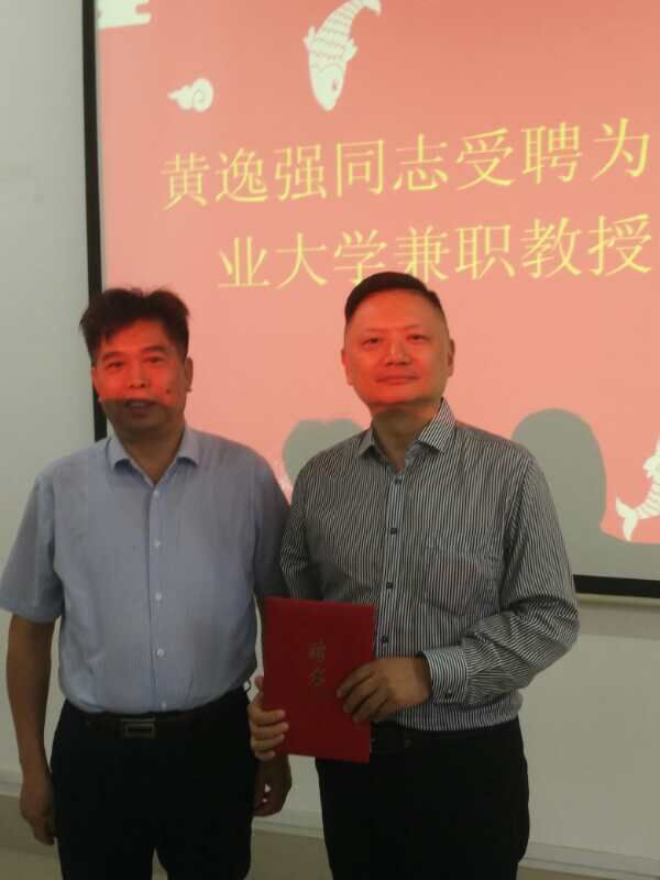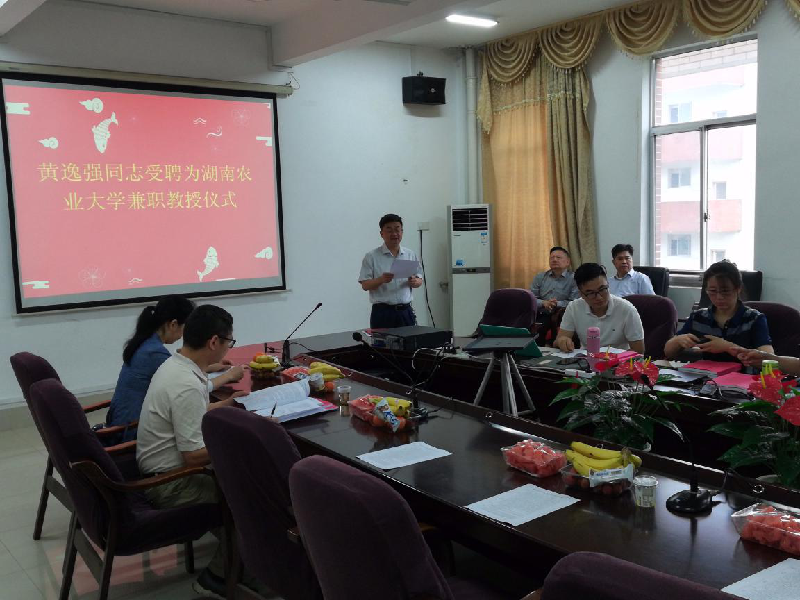 长沙兴嘉生物工程股份有限公司董事长、高级畜牧师同志黄逸强受聘为湖南农业大学兼职教授仪式在湖南农业大学11教505会议室举行。湖南农业大学卢向阳副书记、邹冬生副校长、人事处林丽娅副处长、生物科学技术学院院长方俊、党委书记尹红及生科院班子成员等出席了授聘仪式,卢向阳副书记向黄逸强先生颁发了兼职教授聘书。
