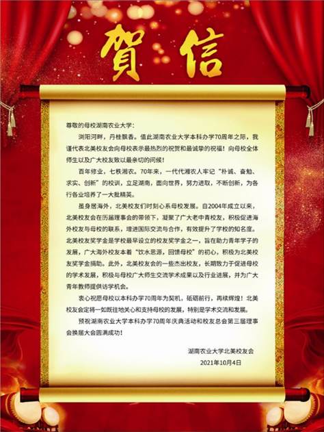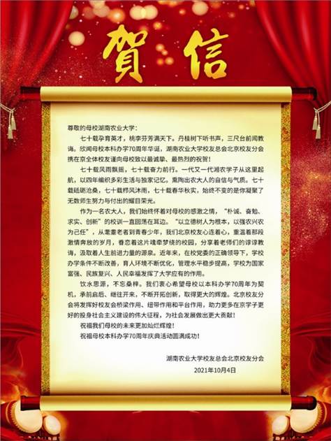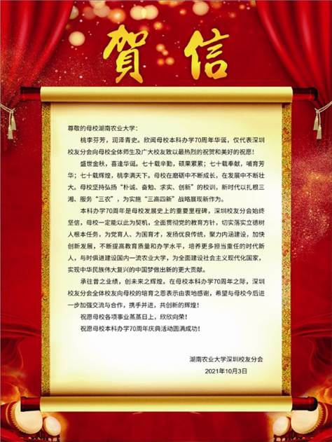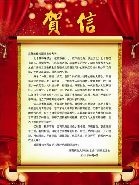在庆祝学校本科办学70周年之际,湖南农业大学校友总会北京校友分会、湖南农业大学校友总会广州校友分会、湖南农业大学深圳校友分会、湖南农业大学湖北校友分会、湖南农业大学北美校友会等30多个校友分会向学校发来贺信,预祝湖南农业大学本科办学70周年庆典活动取得圆满成功!