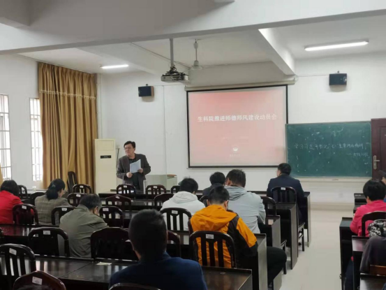 10月14日下午,各个教工支部利用主题党日活动时间组织全体教工党员学习《湖南省师德师风教育读本》,并且每位教工党员谈到自身对于师德师风建设的看法。10月18日上午,学院党委理论中心组扩大会议组织全体领导班子、系主任等教师学习《湖南省师德师风教育读本》和学校师德师风建设方案。10月18日下午,生科院召开全体教职工大会,传达教育厅蒋昌忠厅长和曹世凯组长在全省教育系统师德师风建设视频工作会上的讲话精神,引导广大教师深入学习师德师风建设相关文件,努力打造高素质专业化创新型教师队伍。生科院全方位、多举措、多角度地开展师德师风建设,旨在引导激励学院教师全面贯彻习近平总书记关于“三个牢固树立”、“四有”好老师、“四个引路人”“四个相统一”“六要”等重要论述的有关要求,做到内化于心、外化于行,树立良好师德师风,