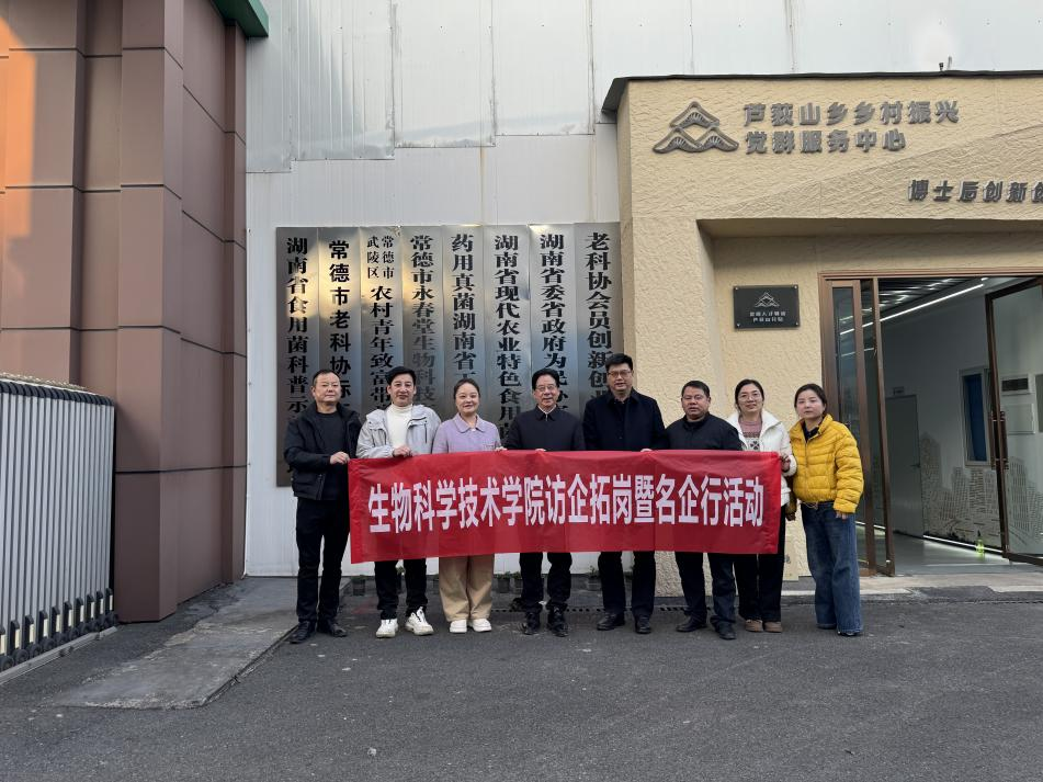 为深入贯彻落实党中央、国务院关于高校毕业生就业工作的决策部署,进一步拓宽毕业生就业渠道,深化产学研用融合,2026年1月6日至7日,湖南农业大学生物科学技术学院党委书记朱杰辉、党委副书记肖露、副院长魏宝阳、学工办主任彭晓、学工办副主任解李帅一行赴常德市开展访企拓岗专项行动。